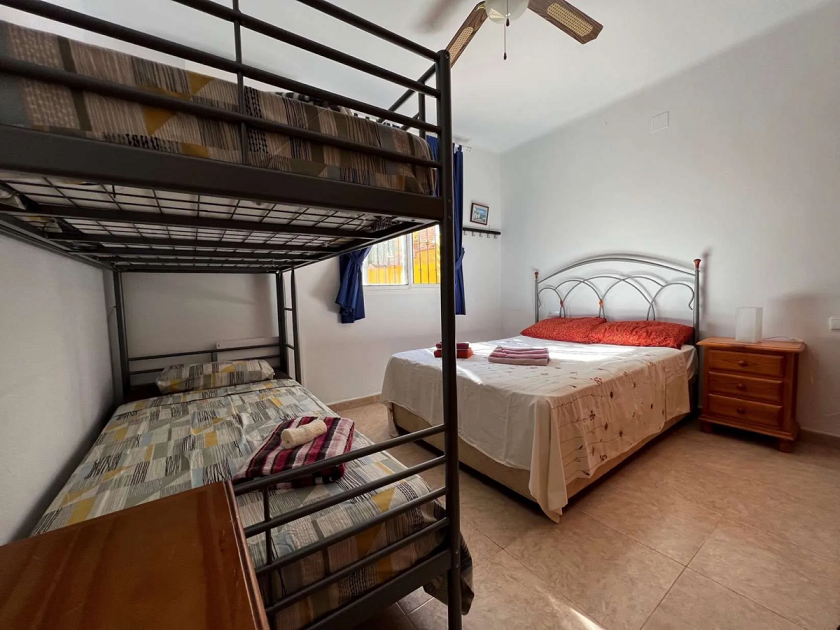 Bedroom 1 accommodates two people with a 1.80-metre box spring bed. Bedroom 2 is larger, sleeping up to four people, and includes a bunk bed and a double bed (1.40m wide). Duvets, sheets, and pillows are supplied, so you need not bring your own. There are two bathrooms: one with a sink and shower, and the other with a sink and bath. Towels are also provided.