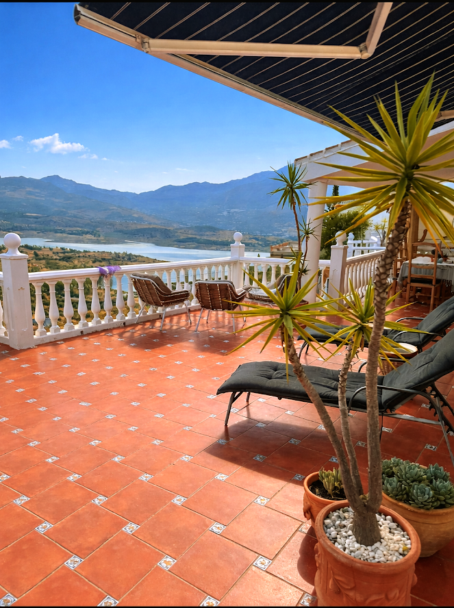 On the terrace, with a large dining table, various seating areas, and loungers, you can relax in the sun or shade and enjoy the enchanting view, which changes every day and changes with the light.