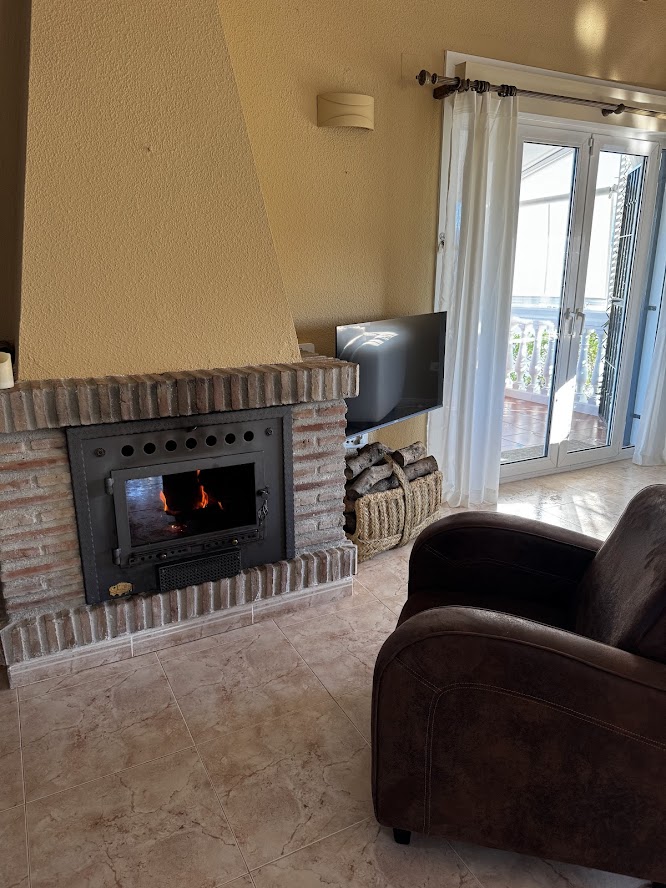 On the ground floor are the hallway with a toilet, the kitchen, and the spacious, bright living room with large glass doors leading to a large terrace. The living room was refurbished and fully modernized in 2025. The room offers a large comfortable corner sofa, a dining area for six, a smart TV with Chromecast, Wi-Fi, and a wood-burning stove for cooler evenings later in the season.